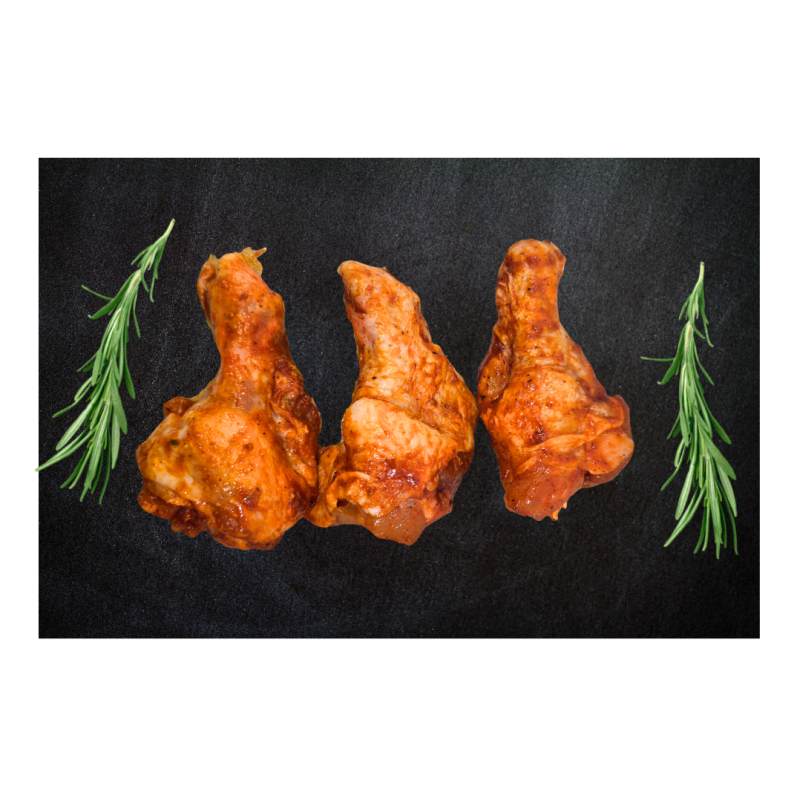 viščiukų broilerių sparnų peteliai, marinolis "Grillbutter" (augalinis aliejus (rapsų), augaliniai riebalai (iš dalies hidrinti palmių, visiškai hidrinti rapsų (0,7-3,0%)), joduota valgomoji druska (18,2%), prieskoniai (karis, svogūnai, muskatas ir kt.), cukrus (3%), kvapiosios medžiagos, gliukozės sirupas, mielių ekstraktas, dekstrozė (2%), prieskoniniai augalai (petražolės, porai)). 100g. produkto maistinė ir energetinė vertė: 703kj/168kcal. Riebalai 10,7g. iš kurių sočiųjų riebalų rūgščių 3,91g. Angliavandeniai 0,2g. iš kurių cukrų 0,1g. Baltymai 17,9g. Druska 0,9g.