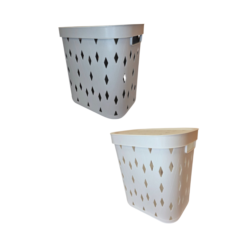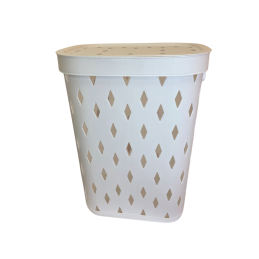 Erdvus ir praktiškas plastikinis skalbinių krepšys su dangčiu, dekoruotas deimantų rašto skylutėmis, užtikrinančiomis gerą oro cirkuliaciją. Lengvas, patogus nešti dėl integruotų rankenų, puikiai tinka vonios kambariui ar skalbyklai.