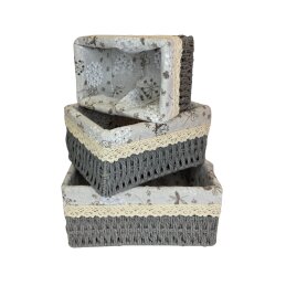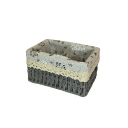 Elegantiškas stačiakampis pintas krepšelis su nuimamu audiniu ir dekoratyvine nėrinių juostele – puikus pasirinkimas norint tvarkingai ir stilingai susidėti kasdienius daiktus. Derinamas pintas pagrindas ir švelnių tonų gėlėtas audinys suteikia interjerui jaukumo bei natūralumo. Tinka įvairioms namų erdvėms – nuo vonios iki svetainės.