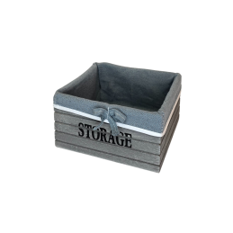 Stilingas medinis krepšelis su audinio įdėklu – praktiškas ir dekoratyvus daiktas, tinkantis tiek namų, tiek biuro aplinkai. Pilkos spalvos medinis korpusas su užrašu STORAGE ir dekoratyvine juostele bei kaspinu suteikia krepšeliui modernų, bet jaukų įvaizdį. Audinį galima išimti ir išplauti.