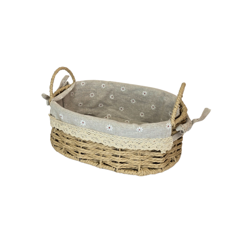 Dekoratyvus pintas krepšelis su švelnios spalvos audiniu viduje ir nėrinių juostele viršuje – puikus pasirinkimas tiek praktiškam naudojimui, tiek interjero papuošimui. Natūrali pintinė struktūra ir gėlėtas audinys suteikia krepšeliui jaukumo bei kaimiško stiliaus žavesio.