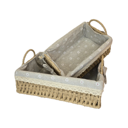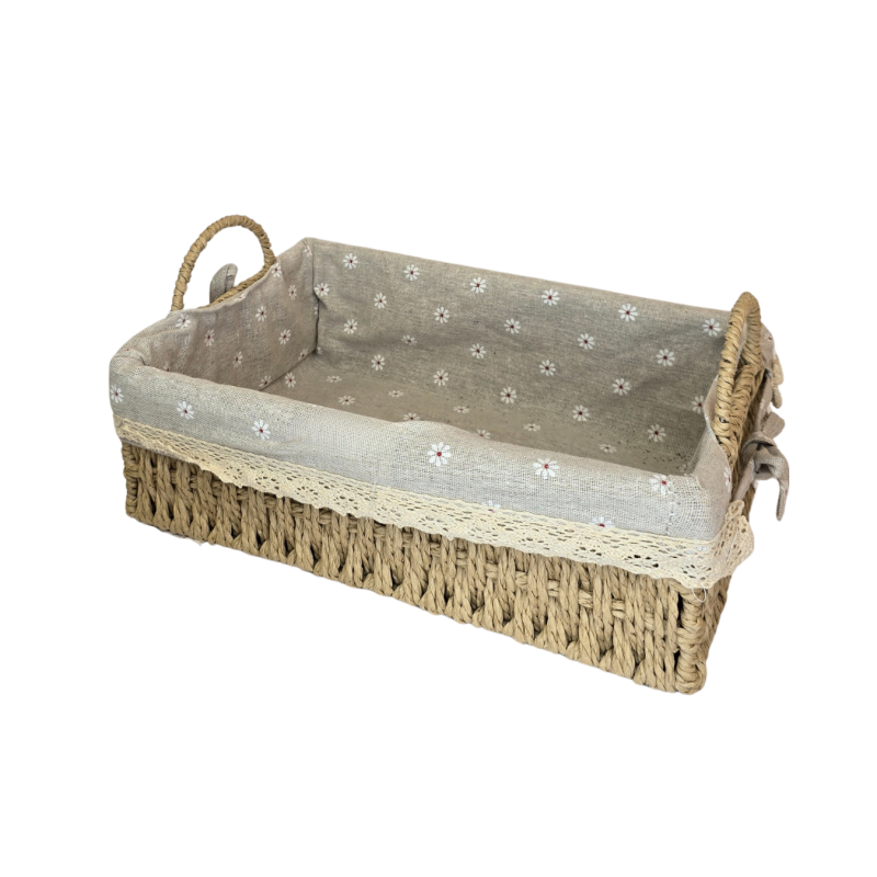 Dekoratyvus pintas krepšelis su švelnios spalvos audiniu viduje ir nėrinių juostele viršuje – puikus pasirinkimas tiek praktiškam naudojimui, tiek interjero papuošimui. Natūrali pintinė struktūra ir gėlėtas audinys suteikia krepšeliui jaukumo bei kaimiško stiliaus žavesio.