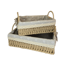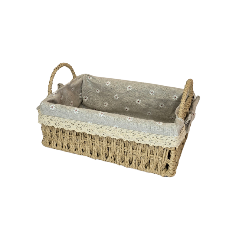 Dekoratyvus pintas krepšelis su švelnios spalvos audiniu viduje ir nėrinių juostele viršuje – puikus pasirinkimas tiek praktiškam naudojimui, tiek interjero papuošimui. Natūrali pintinė struktūra ir gėlėtas audinys suteikia krepšeliui jaukumo bei kaimiško stiliaus žavesio.