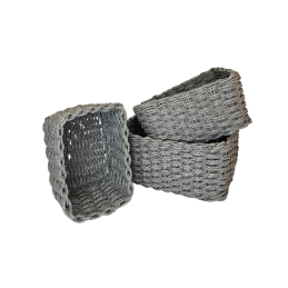 Universalaus dizaino pintas krepšelis – praktiškas sprendimas įvairiems daiktams laikyti ir tvarkai palaikyti. Pilkos spalvos pynimas suteikia modernumo ir lengvai dera prie bet kokio interjero. Krepšelis patvarus, lengvas ir patogus naudoti tiek namuose, tiek biure.