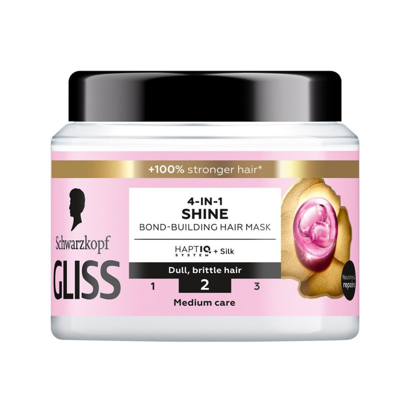 Gliss 4 funkcijų žvilgesio suteikianti, plaukų saitus atkurianti kaukė su HAPTIQ sistema ir šilku, skirta nualintiems ir trapiems plaukams. Formulė padeda stiprinti plauko struktūrą, atkurti vidinius saitus ir suteikti plaukams sveikai atrodantį žvilgesį.