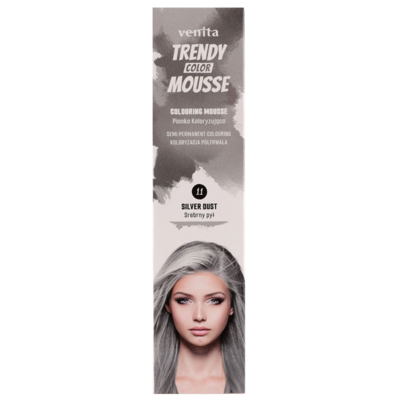 Suteikite savo plaukams modernų, elegantišką ir šaltą sidabrinio atspalvio efektą su Venita Trendy Color Mousse spalvinančiomis putomis. Ši pusiau ilgalaikė dažymo priemonė leidžia lengvai atnaujinti įvaizdį, suteikti plaukams madingą pilkšvai sidabrinį toną ir subtilų švytėjimą be ilgalaikių pokyčių.