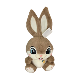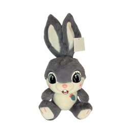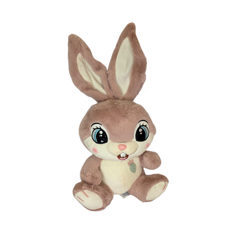 Mielas, didelių akių, minkštas pliušinis zuikis su ilgomis ausimis. Ant pilvuko – siuvinėtas morkytės motyvas. Puikiai tinka apkabinimams ir dovanoms.