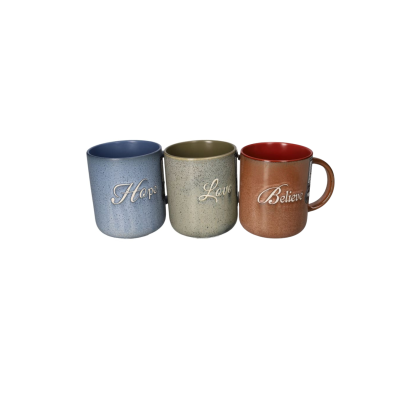 Stilingas ir talpus porcelianinis puodelis, išsiskiriantis šiltu, jaukiu dizainu ir prasmingais užrašais. Puodeliai dekoruoti subtiliu tekstūriniu paviršiumi ir reljefiniais žodžiais, kurie suteikia išskirtinumo ir emocinę vertę kasdieniam naudojimui.