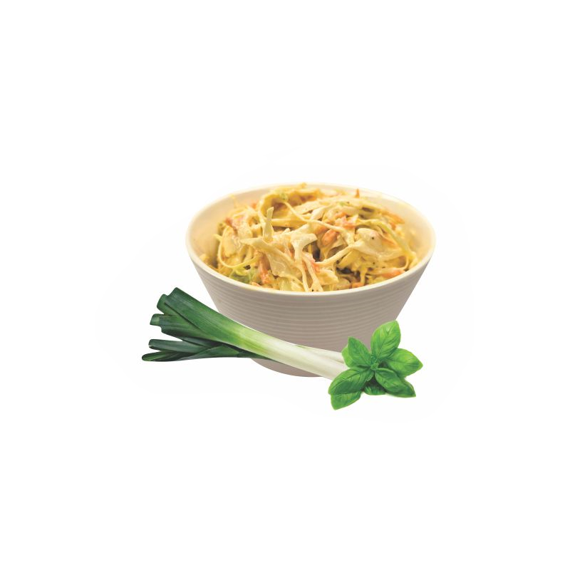 švieži kopūstai 70%, morkos 20%, majonezas tradicinis((vanduo,rapsų aliejus (35%), modifikuotas bulvių krakmolas, cukrus, druska,KIAUŠINIŲ TRYNIŲ MILTELIAI su gliukozės sirupu, modifikuotas kukurūzų krakmolas, rūgštingumą reguliuojančios medžiagos (acto ir citrinų rūgštys), stbilizatorius (akacijų ir ksantano dervų mišinys), GARSTYČIŲ kvapioji medžiaga, konservantai: kalio sorbatas, natrio benzoatas, majonezas salotoms ((rapsų aliejus 50%, vanduo, spirito actas, GARSTYČIOS (vanduo, spirito actas, GARSTYČIŲ SĖKLOS (19%), cukrus, druska, karamelizuotas cukrus, prieskoniai, kvapiosios medžiagos), modifikuotas bulvių krakmolas, KIAUŠINIŲ TRYNIŲ milteliai, druska, rūgštingumą reguliuojančios medžiagos - citrinų rūgštis, tirštikliai - guaro guma ir natrio alginatas,modifikuotas kukurūzų krakmolas, GARSTYČIŲ kvapioji medžiaga, dažiklis - beta karotenas), porai 5%, joduota druska, juodieji malti pipirai.