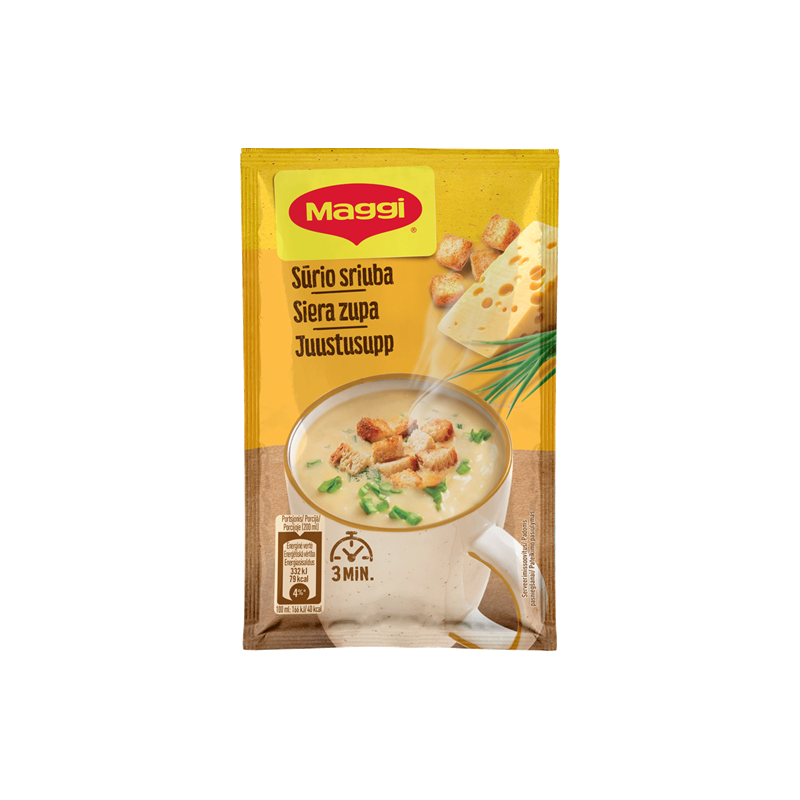 Skrebučiai 15,8% (KVIEČIŲ miltai, palmių aliejus, druska, mielės), bulvių krakmolas, SŪRIO milteliai 11,2% (iš PIENO) (su ementaliu), palmių riebalai, nugriebto PIENO milteliai, GRIETINĖLĖS milteliai (iš PIENO) aromato ir skonio stiprikliai (mononatrio glutamatas, dinatrio 5'-ribonukleotidai), druska, KVIEČIŲ miltai, mielių ekstraktas, cukrus, kvapiosios medžiagos (su PIENU, SOJA), džiovinti svogūnai, laiškinis česnakas, IŠRŪGŲ milteliai (iš PIENO), ciberžolė, tirštiklis (ksantano derva). Sudėtyje gali būti KIAUŠINIŲ, SALIERŲ ir GARSTYČIŲ. Sudėtyje yra: GLITIMO TURINČIŲ JAVŲ, PIENO IR JO PRODUKTŲ (ĮSKAITANT LAKTOZĘ), SOJŲ PUPELIŲ IR JŲ PRODUKTŲ.