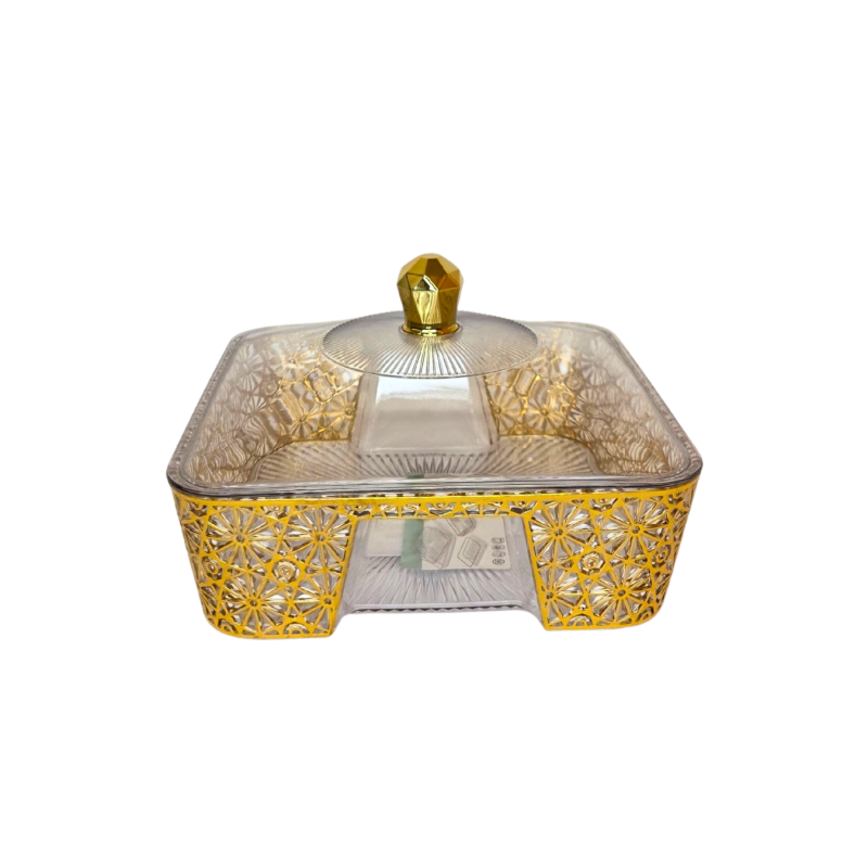 Elegantiškas plastikinis indas su dekoratyviniu auksiniu raštu ir stilingu, brangakmenį primenančiu dangčio rankenėliu. Puikiai tinka saldumynams, vaisiams, sausainiams ar užkandžiams patiekti šventėse bei kasdienybėje. Skaidrus dizainas leidžia matyti turinį, o dangtis apsaugo nuo dulkių ir išlaiko maisto šviežumą.