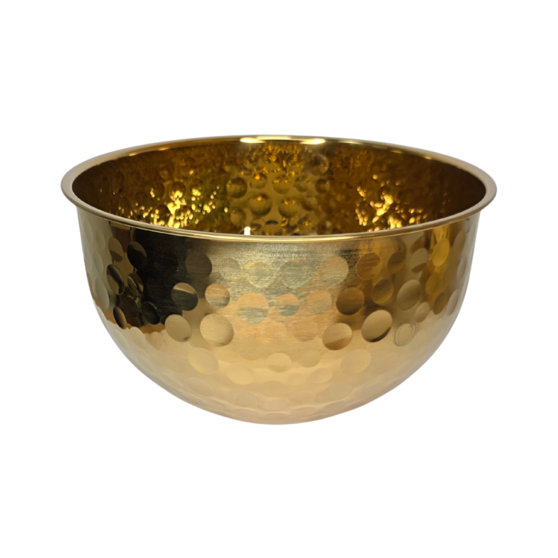 Auksinės spalvos metalinis dubenėlis su faktūriniu paviršiumi
