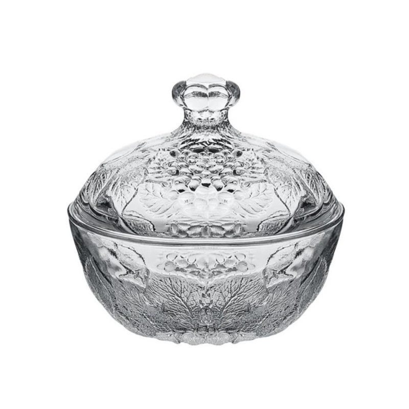 Klasikinio dizaino stiklinis indas su dekoratyviu dangteliu, puikiai tinkantis cukrui, saldainiams, sausainiams ar kitiems smulkiems užkandžiams laikyti ir patiekti. Reljefinis raštas suteikia elegancijos ir puošnumo, todėl indas gražiai atrodo tiek kasdienėje, tiek šventinėje aplinkoje.