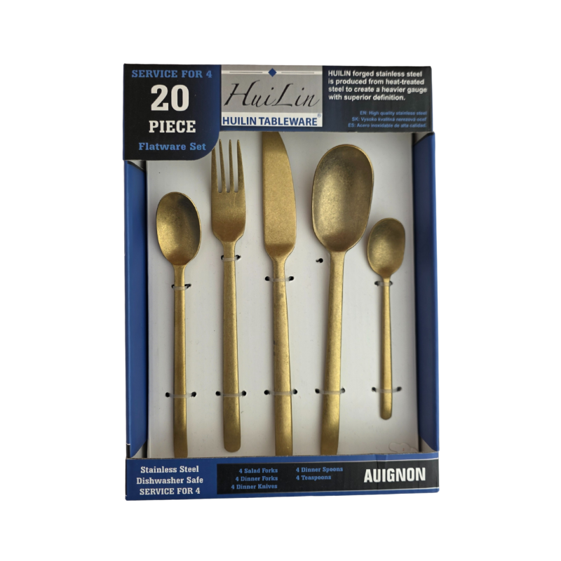 Elegantiškas 20 dalių stalo įrankių rinkinys, pagamintas iš aukštos kokybės nerūdijančio plieno. Įrankiai pasižymi solidžia matinės aukso spalvos apdaila, kuri suteikia prabangos ir išskirtinumo kiekvienam stalui. Puikiai tinka tiek kasdieniam naudojimui, tiek šventinėms progoms. Rinkinys patogiai supakuotas ir saugus plauti indaplovėje.