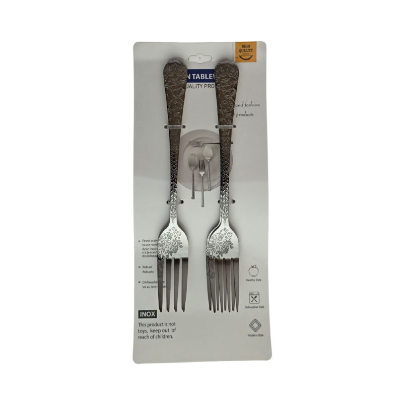 Elegantiškas nerūdijančio plieno šakučių rinkinys išsiskiria išraiškingu gėlių rašto dizainu, kuris suteikia stalui prabangos ir stiliaus. Šakutės yra tvirtos, patogios laikyti ir atsparios rūdijimui, todėl puikiai tinka tiek kasdieniam naudojimui, tiek šventinėms progoms. Kokybiškas paviršius lengvai valomas, o įrankiai tinka plauti indaplovėje.