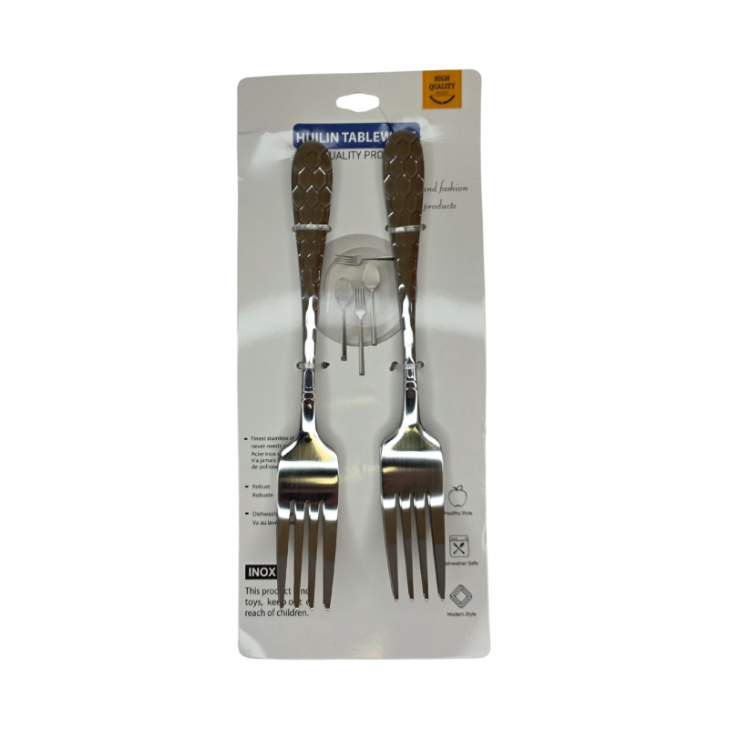 Aukštos kokybės nerūdijančio plieno šakutės su elegantišku ornamentuotu koteliu. Patvarios, blizgios ir lengvai valomos. Puikiai dera prie kitų Huilin stalo įrankių ir tinka tiek kasdieniam, tiek šventiniam stalui.