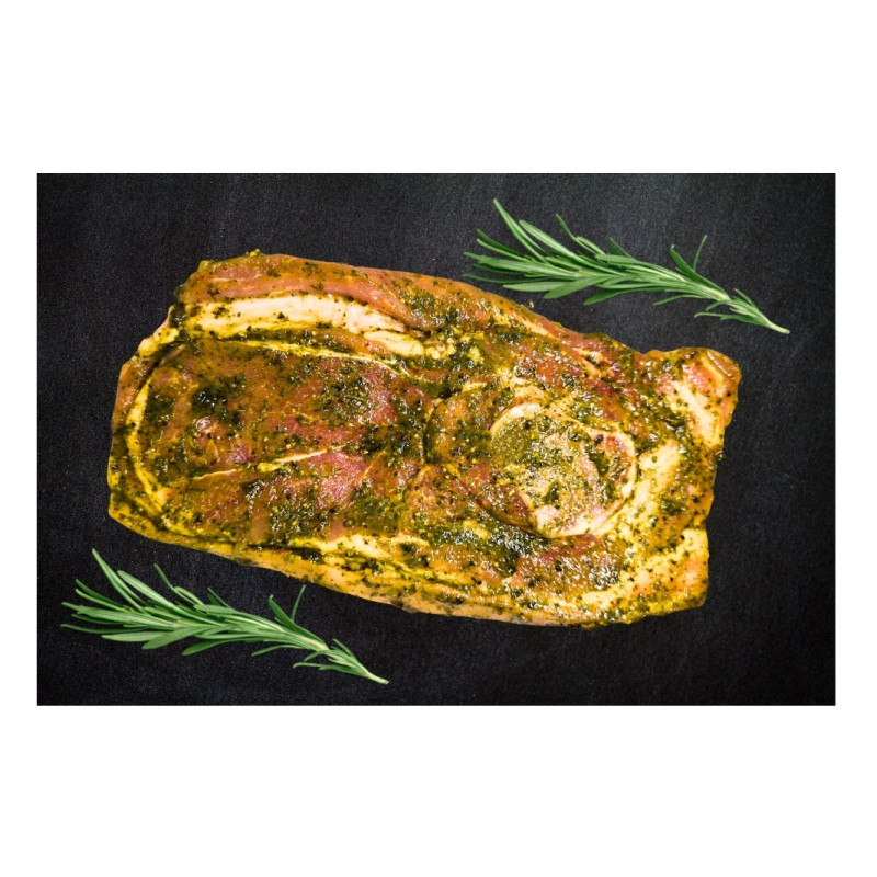 kiaulienos mentė su kaulu, aliejinis prieskonių mišinys "PROVENCE": augalinis aliejus (rapsų), augaliniai riebalai (iš dalies hidrinti palmių, visiškai hidrinti rapsų), prieskoniai, valgomoji druska, prieskoniniai augalai (porai, petražolės, bazilikai ir kt.), kvapioji medžiaga (natūralus česnakų ekstraktas).