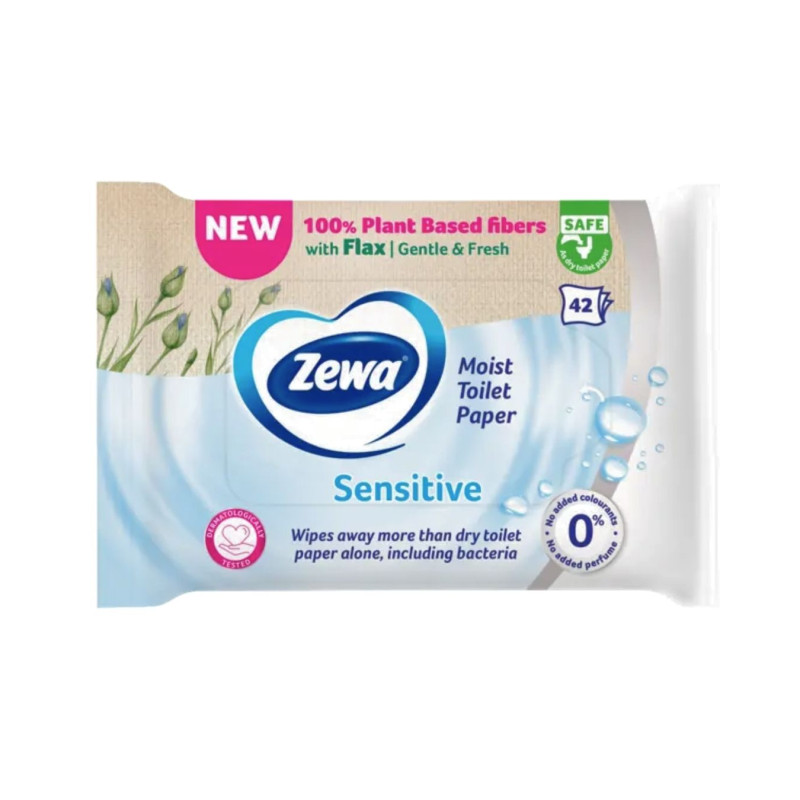 Zewa Sensitive drėgnas tualetinis popierius – švelnus ir patikimas kasdienės higienos sprendimas, skirtas jautriai odai. Pagamintas iš 100 % augalinės kilmės pluošto su linų skaidulomis, užtikrina švelnų, bet efektyvų valymą. Be pridėtų dažiklių ir be pridėtų kvapiklių.