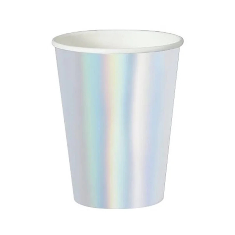 Stilingi ir modernūs popieriniai puodeliai su holografiniu blizgesiu — puikus pasirinkimas gimtadieniams, teminiams vakarėliams, naujametiniams renginiams ar kitoms šventėms. Dėl šviesą atspindinčio paviršiaus puodeliai sukuria ypatingą, žvilgantį efektą, kuris suteiks stalo dekorui išskirtinumo.