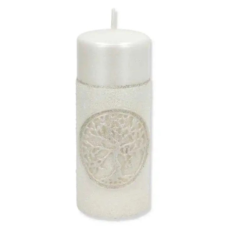Elegantiška balta žvakė su reljefiniu Gyvybės medžio motyvu ir švelniu blizgesiu. Tai puikus pasirinkimas šventiškam dekorui, dovanai ar jaukiai namų atmosferai sukurti. Subtilus dizainas lengvai dera prie įvairių interjerų ir suteikia aplinkai prabangos bei ramybės pojūtį.