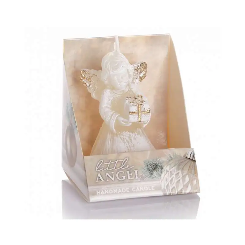 Jauki ir švelni dekoratyvinė žvakė, vaizduojanti mažą angelą su dovanėle. Pagaminta rankomis, dekoruota auksiniais akcentais ir subtiliu perlamutriniu blizgesiu – puiki šventinė detalė jūsų namams arba miela dovana.