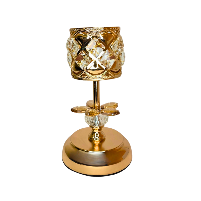 Išskirtinio dizaino žvakidė, dekoruota auksinės spalvos metalo detalėmis ir prabangiai atrodančiais kristalo imitacijos akcentais. Papildomi dekoratyviniai elementai ties stovu suteikia žvakidei elegancijos ir išskirtinumo. Tvirtas pagrindas užtikrina stabilumą, todėl žvakidė puikiai tinka stalo serviravimui, šventėms ar interjero papuošimui.