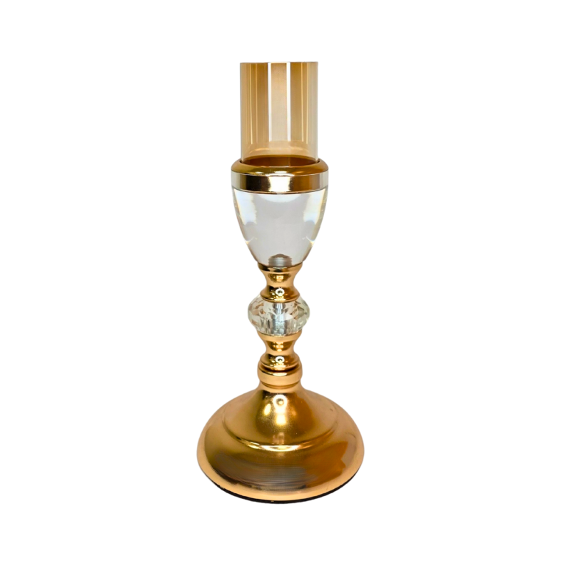 Elegantiška žvakidė, derinanti auksinės spalvos metalą ir skaidrius dekoratyvinius elementus. Viršuje esantis švelniai tonuotas stiklo gaubtas suteikia jaukų šviesos efektą ir apsaugo žvakės liepsną. Skaidrus dekoratyvinis tarpinis akcentas ir aptaki forma suteikia žvakidei prabangos įspūdį. Tvirtas pagrindas užtikrina stabilumą, todėl ši žvakidė puikiai tinka šventiniam stalui, namų interjerui ar kaip stilinga dovana.