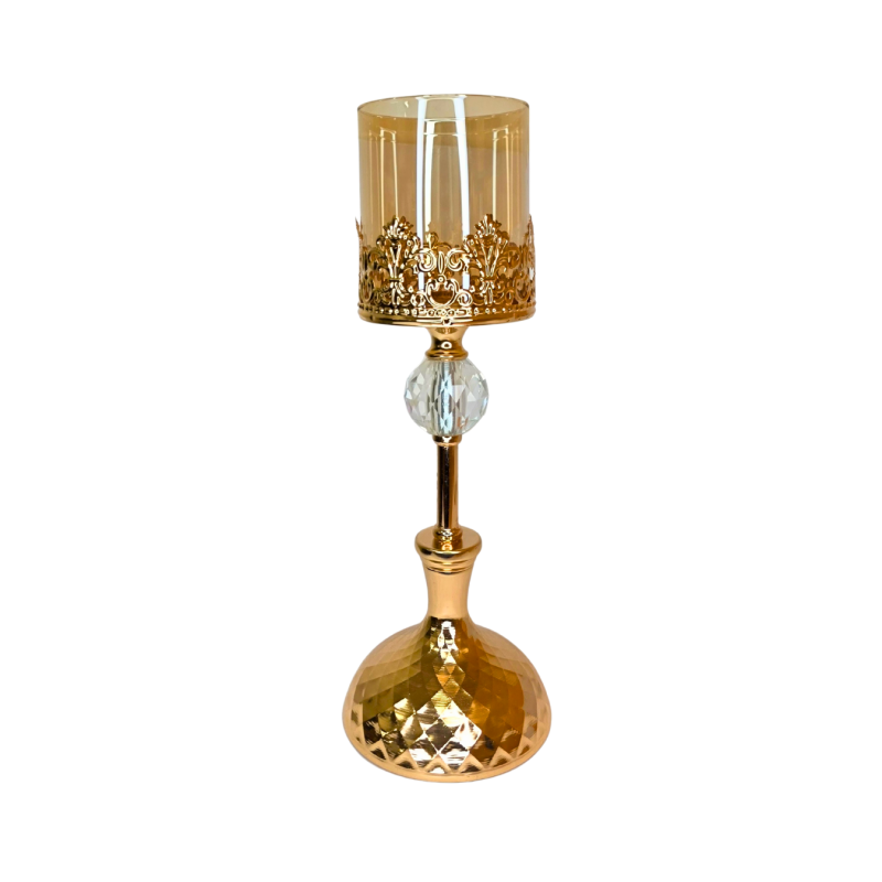 Prabangi, elegantiško dizaino žvakidė, sukurta derinant auksinės spalvos metalą, ir skaidrų kristalo imitacijos akcentą. Viršuje esantis švelniai tonuotas stiklo gaubtas su metaliniu ornamentu suteikia žvakės šviesai ypatingo jaukumo ir rafinuotumo. Tvirtas, rombo rašto pagrindas ne tik užtikrina stabilumą, bet ir papildo bendrą estetinį žvakidės įvaizdį. Puikus pasirinkimas šventiniam stalui, namų interjerui ar išskirtinei dovanai.