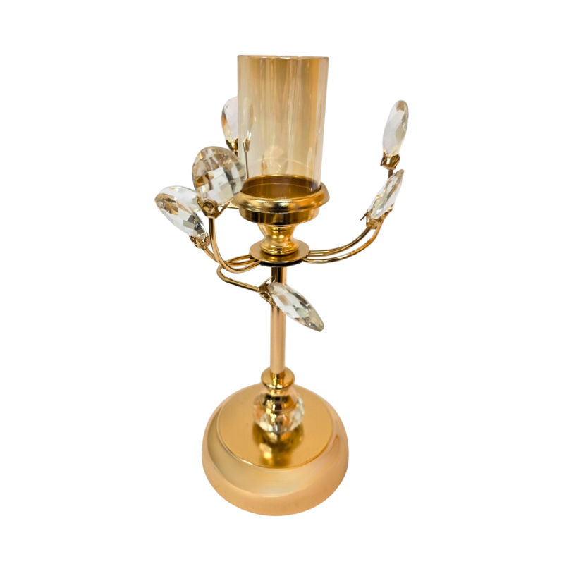 Elegantiška auksinė žvakidė su stiklo gaubtu ir aplink jį išdėstytomis dekoratyvinėmis kristalo formos detalėmis. Žvakidės laikiklis puošniai išlenktas, o skaidrūs kristalai suteikia prabangos ir šviesos žaismo efektą.