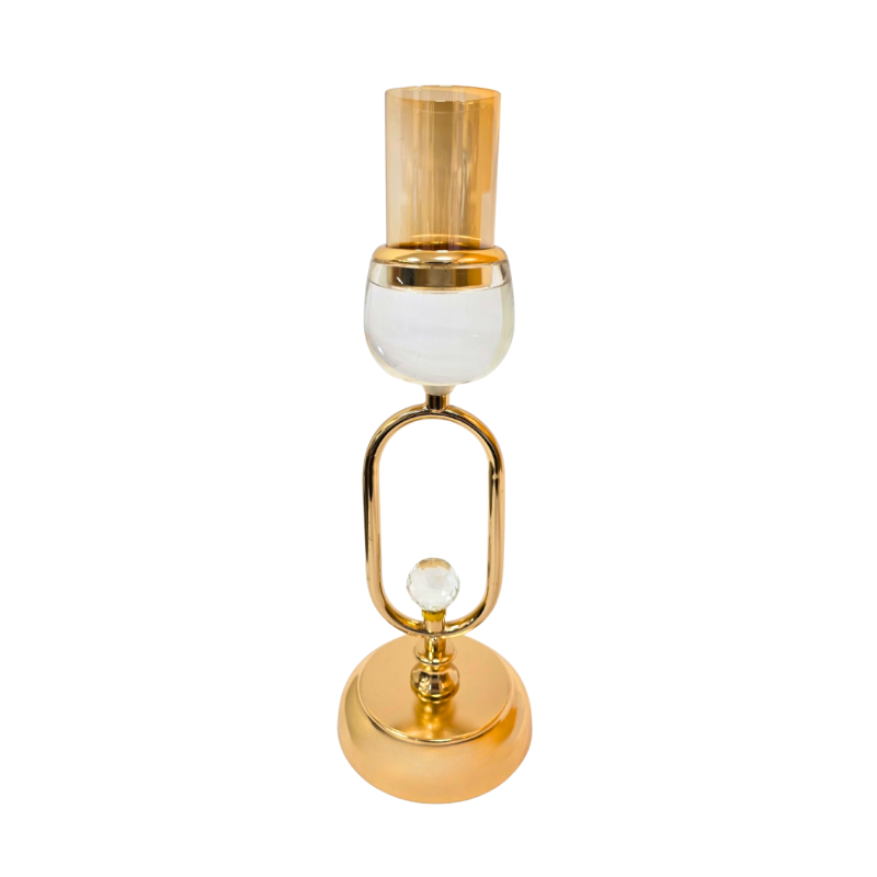 Elegantiška ir prabangi auksinė žvakidė su dekoratyviniu kristalu. Moderni ovalo formos konstrukcija suteikia lengvumo, o aukso spalva – prabangos įspūdį. Tai puikus akcentas šventiniam stalui, komodai ar interjero dekorui.
